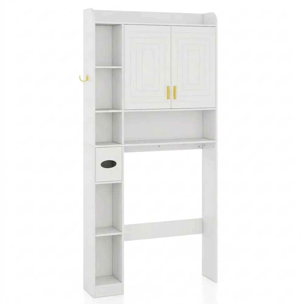 Este armario para el baño ofrece amplio espacio para organizar productos de aseo y otros elementos esenciales. Incorpora un compartimento con puertas dobles, 7 estantes abiertos y un gancho lateral. Una tira de LED integrada con 3 colores ajustables mejora la visibilidad en condiciones de poca luz. El diseño de estantes ajustables permite adaptar el espacio a diferentes tamaños de objetos. Está equipado con un dispositivo anti-vuelco para mayor estabilidad. La barra inferior ajustable se adapta a diferentes alturas de tuberías.