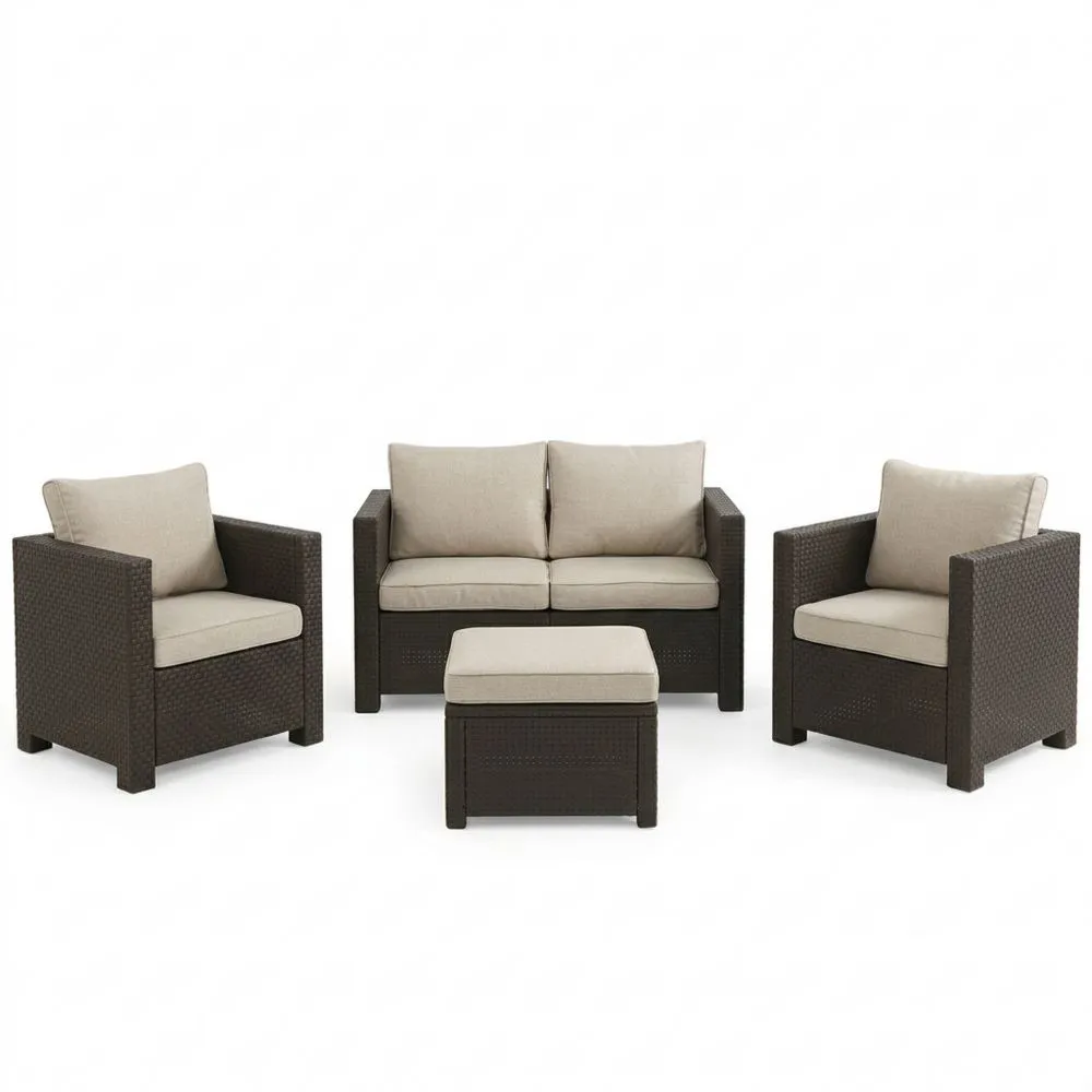 Mejora el ambiente de tu jardín con un conjunto que incluye un sofá de dos plazas, sillones individuales con cojines y una mesa de centro. Diseñado para un fácil montaje sin herramientas y limpieza sencilla con agua y jabón. Fabricado en España utilizando un alto porcentaje de plástico reciclado, este set es resistente a los rayos UV y las condiciones climáticas. Mantiene su color y funcionalidad a lo largo del tiempo.