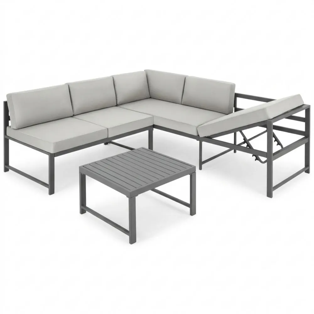 Conjunto de sofás y cojines para exterior, ideal para jardín o terraza. Incluye 2 sillones con cojines impermeables y fundas lavables. El respaldo es ajustable en varias posiciones. Fabricado con aluminio resistente a la intemperie. Este conjunto ofrece flexibilidad en el diseño del espacio exterior, con una mesa funcional de superficie de láminas. La estructura de aluminio ligero facilita su movimiento y limpieza. Los topes de plástico en las patas protegen el suelo y permite la organización flexible del conjunto según el espacio disponible. Cojines diseñados para ofrecer comodidad, con materiales resistentes al agua adecuados para exteriores.