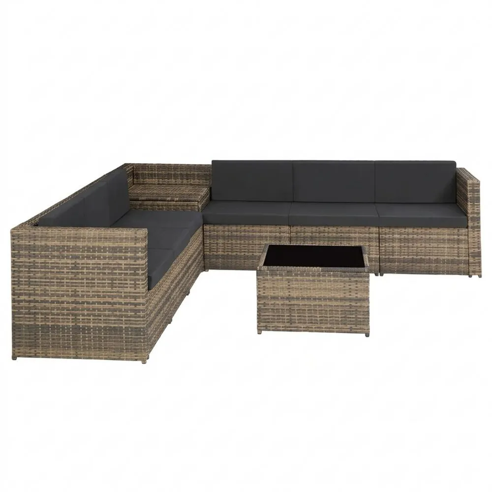 Conjunto para jardín exterior que proporciona un espacio adaptable para terraza, jardín o patio. Incluye sofá amplio y mesa, con ratán conocido por su resistencia a la intemperie. Baúl de almacenaje útil para organizar elementos del jardín, como cojines o juguetes de piscina. Cojines de asiento y respaldo para seis personas, fáciles de limpiar y mantener. Estructura de acero para una base sólida, con tapas de plástico en las patas para proteger el suelo.