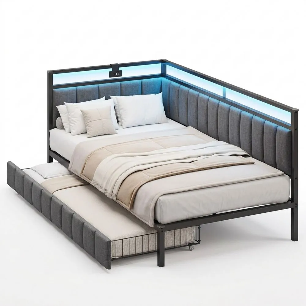 Este sofá cama de 90x190 es útil para diversas necesidades diarias ahorrando espacio. Colócalo contra la pared para usarlo como cama de noche o como sofá de día para disfrutar de juegos, lectura o televisión. Equipado con 3 puertos USB-A y un puerto USB-C en el respaldo, puedes conectar tus dispositivos electrónicos sin esfuerzo. Además, incluye una tira LED RGB que permite ajustar el color e intensidad de la luz mediante una aplicación. El marco de metal con listones asegura robustez y puede soportar hasta 200 kg. Incluye 2 cajones con forro en la base para almacenamiento adicional. Las esquinas con protecciones plásticas evitan choques y el deslizamiento del colchón es controlado por estabilizadores ajustables.